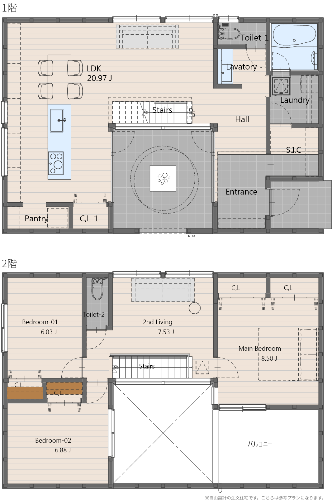 キッチンに立つと1階はもちろん、2階の各部屋までもが見渡せます。家事をしながら、お子さまの遊んでいる様子が伝わってきます。中庭を通して、家族皆の気配を感じることができる間取りになっています。