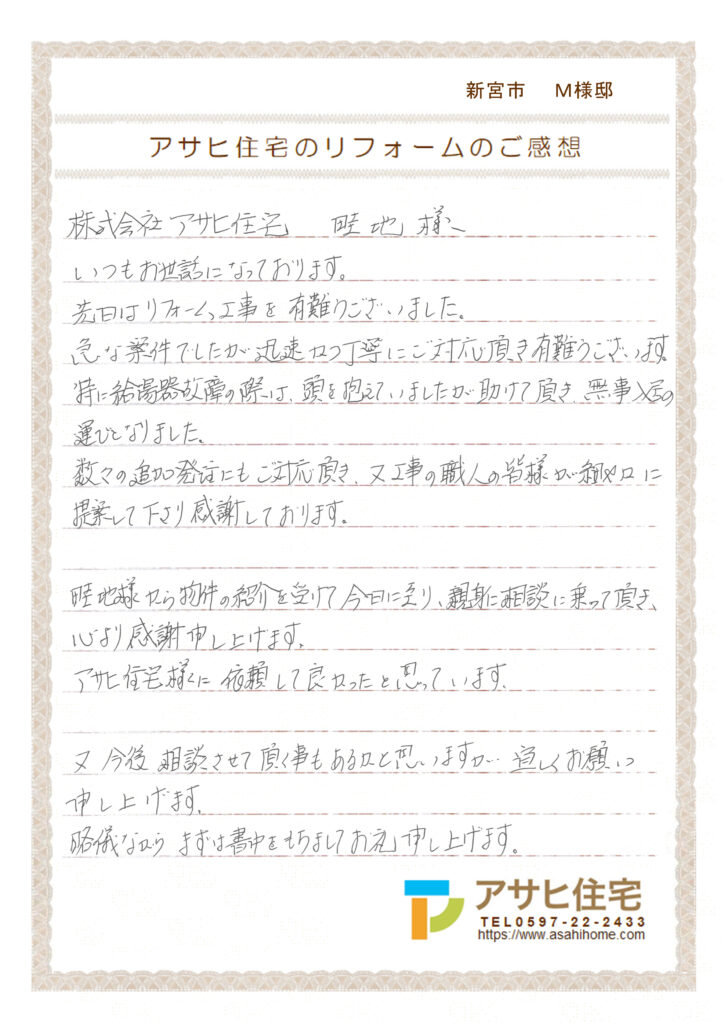 特に給湯器故障の際は、頭を抱えていましたが助けて頂き、無事入居の運びとなりました。
