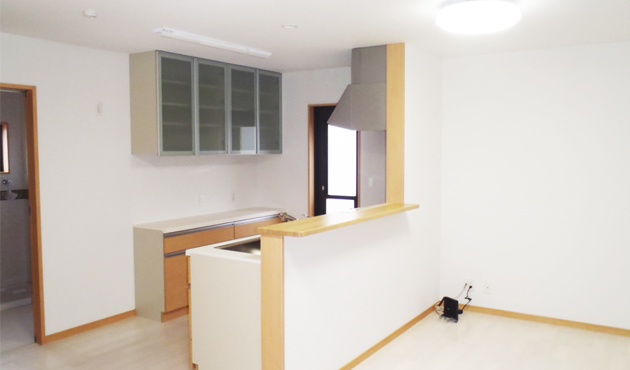 LDK全体では、天井クロスを白いクロスから温かみのある木目調クロスに貼り替え、ダウンライトを施工。