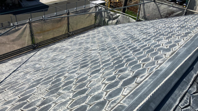 まず最初に足場を組み立て、屋根の塗装にプライマー(下塗材)を塗布し、遮熱性能を持つ屋根用シリコン系塗料(サーモアイSI)を中塗り、上塗りと2回塗りをしました。